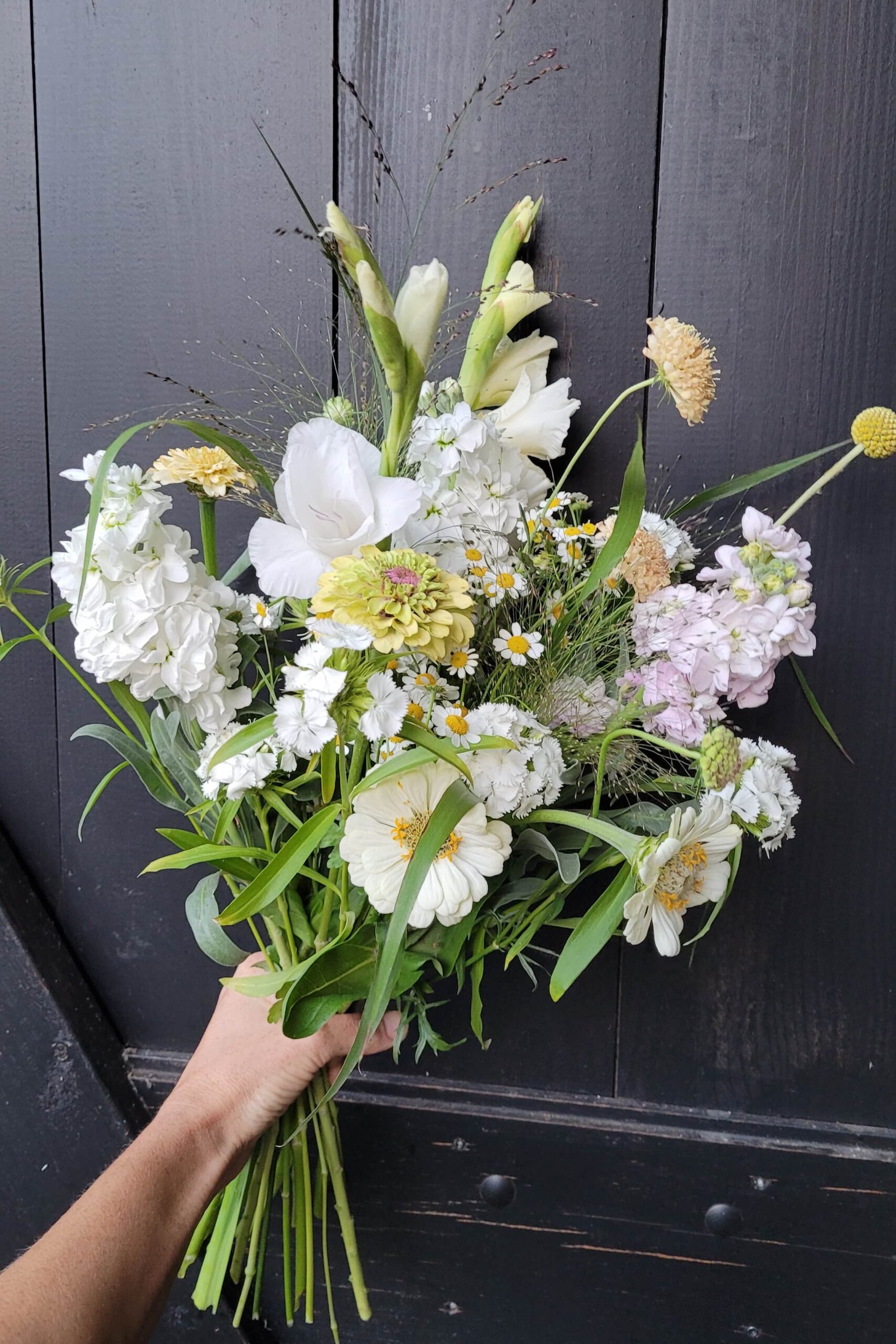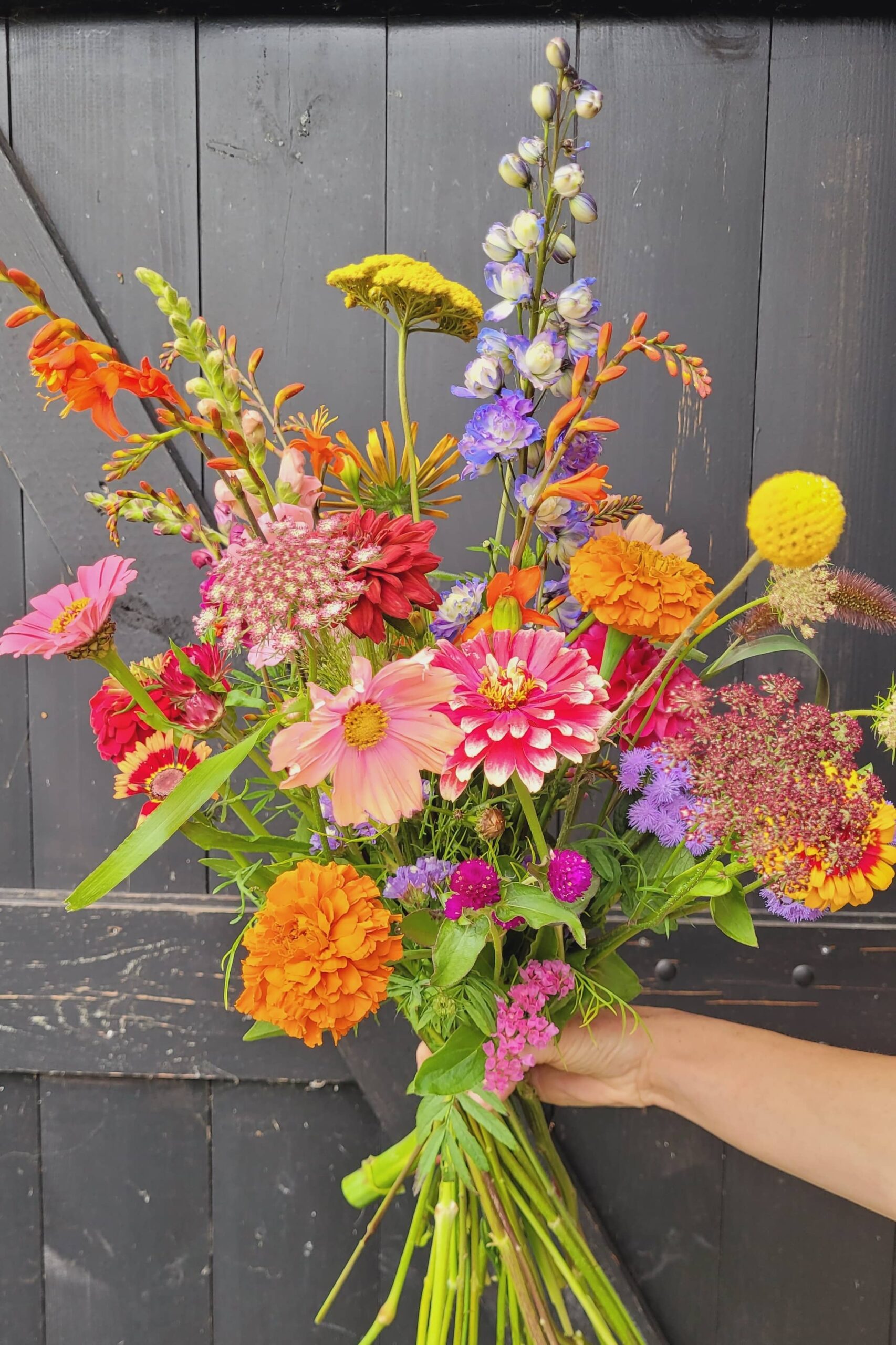 Elke keer weer anders, afhankelijk van wat er op dat moment bloeit – maar altijd vol, weelderig en gifvrij. De bloemen worden lokaal geteeld in Schagerbrug.